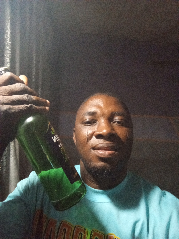 A man holds a green glass bottle with a dark label. He's wearing a light blue t-shirt with colorful graphics on the front. He has dark skin, a short beard, and possible tribal markings on his face. The background is dark, possibly indoors. The lighting is dim and appears to be coming from an unseen source on the left. The image is a close-up selfie, with the man and bottle taking up most of the frame.