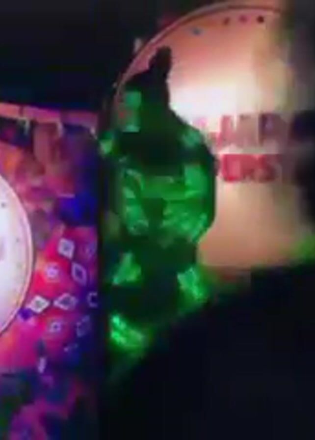 stage performance with two dancers initially appearing in silhouette against a backdrop with the words "Gujarat Superstar" displayed in a circular logo. The lighting then shifts to a blue strobe, highlighting one dancer in a glowing, light-up suit that outlines the performer's body. A man with shoulder-length grey hair, wearing a blue and black outfit, is briefly visible in front of the backdrop. The video is somewhat blurry and shaky.