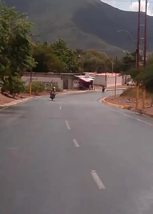 road in a rural area. A person rides a motorcycle along the road, approaching the camera. Another person is walking along the road in the distance. The road has a yellow curb and is surrounded by trees and buildings. In the background, there is a large mountain. The sky is cloudy. The words "Infinix SMART 8" appear at the bottom left of the screen.