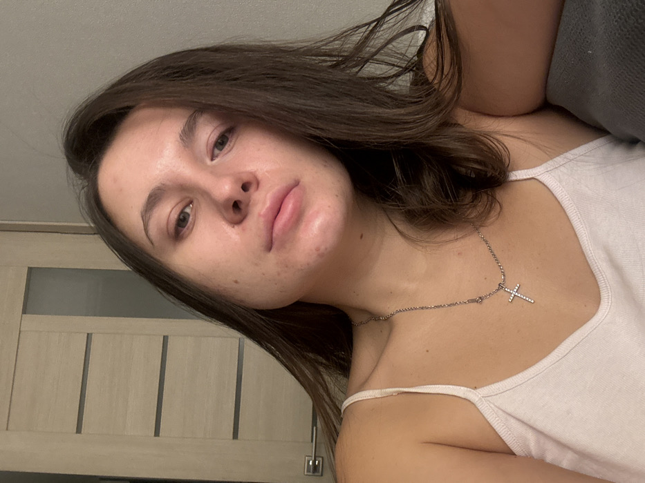 A woman is shown in a close-up selfie. She has brown hair and fair skin. Her skin has some blemishes. She wears a white tank top and a silver necklace with a cross pendant. The background includes a light-colored door with vertical panels and a gray sofa. The image is slightly tilted.