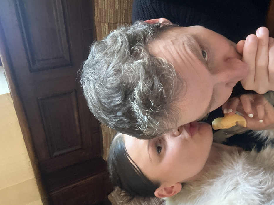 A photo features two people cheek-to-cheek. The person on top has gray hair, a wrinkled face, and is holding a piece of food with their fingers. The person below has dark hair pulled back, fair skin, and is wearing a fluffy white garment. A dark wooden door is partially visible in the background on the left, and a striped wallpaper or textured surface is behind the people. The image is slightly rotated clockwise.