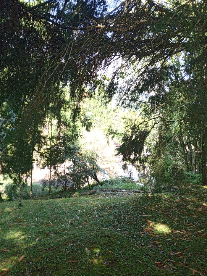 A forest setting with tall trees creating a dense canopy overhead. Sunlight streams through gaps in the leaves, illuminating a grassy area covered with fallen leaves. In the distance, a body of water is visible, surrounded by more trees and some kind of structure, possibly a building. The overall scene suggests a tranquil and shaded natural environment.