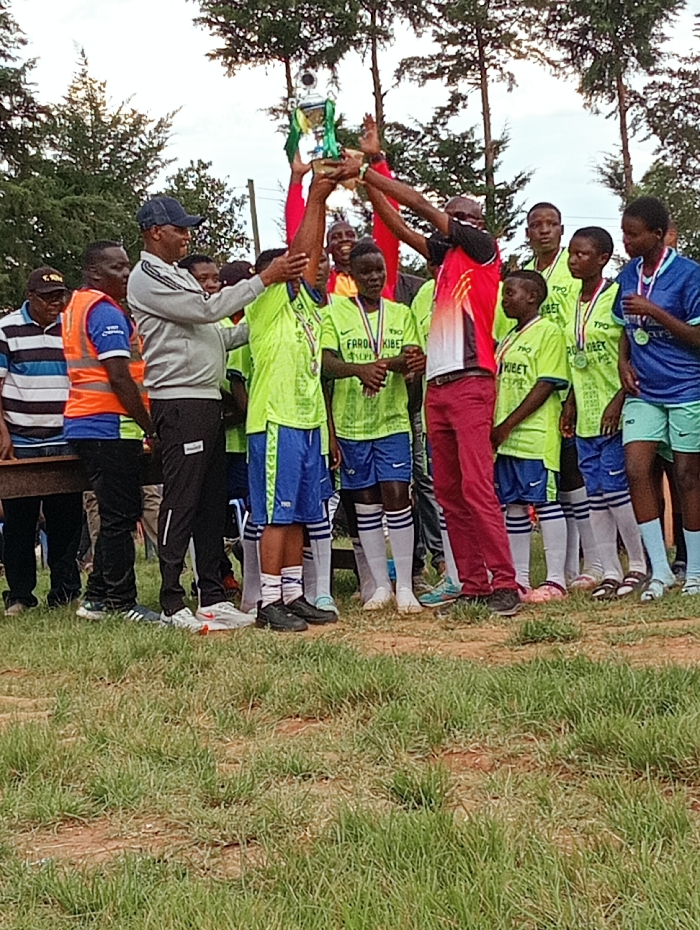 The image depicts an outdoor award ceremony in Ngenyilel ward, Kenya, featuring a group of approximately 12-15 individuals. At the center, a silver and green trophy is held aloft by multiple hands, including a young person in a neon green uniform and an adult male in a red and black patterned shirt. Another adult male, wearing a grey long-sleeved shirt and a dark cap, stands to the left, also touching the trophy as it is presented. The central group consists of young individuals, predominantly female, dressed in matching neon green short-sleeved shirts, blue shorts, and white socks, many wearing circular silver medals around their necks. Their shirts bear text including "FAROJ KIBET" and "ALPHA." One individual on the far right wears a blue shirt with "TPO" and "PRO" text and light blue shorts, also with a medal. To the far left, an adult male in an orange safety vest over a blue shirt is visible. The ground is a mix of green grass and exposed dirt. The background features several tall, slender trees under an overcast sky.