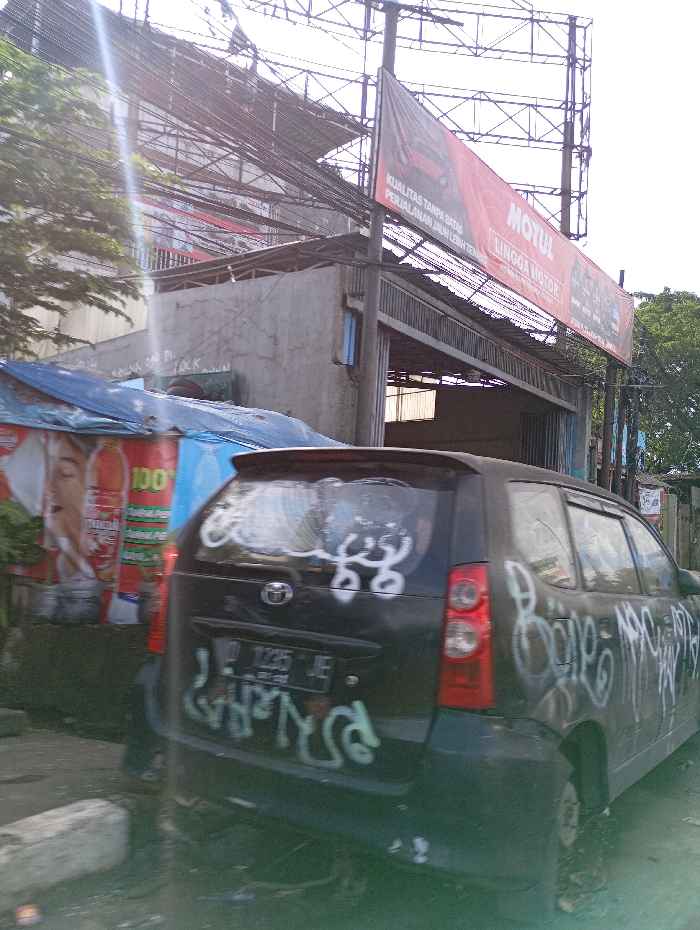 A black, graffiti-covered van is parked on the side of a street. The van has a license plate that reads "D 1235 JE". Behind the van, a building with a "MOTUL" sign can be seen. The scene appears to be in an urban or industrial area. The van is heavily vandalized, with graffiti covering the rear window and the sides.