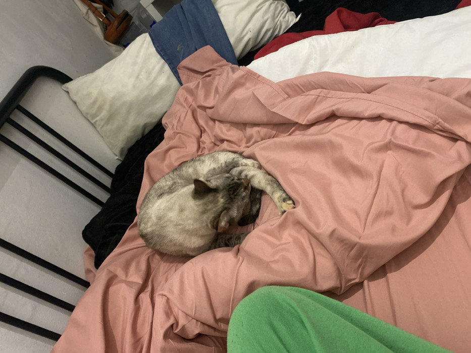 The scene takes place in an indoor bedroom located within the city of Barcelona, Spain. A short-haired cat, exhibiting light grey and tan tabby-like markings, is curled up and resting on a bed. The cat's back faces the viewer, with its head tucked towards its body and one foreleg extended forward. The bed is covered by a wrinkled, pink/peach-colored duvet or blanket. In the lower-left quadrant, a portion of green fabric is visible, suggesting the presence of a person or item of clothing adjacent to the cat. To the right of the cat, the bedding includes a white sheet or blanket. Further right, a black fabric item and a light-colored, possibly off-white, pillow with minor discoloration are present. A pair of blue denim trousers is folded or draped over the pillow. The bed frame incorporates a black metal headboard with vertical and horizontal bars. The wall behind the headboard is light-colored and appears to have a subtle texture. In the upper-right background, behind the bed, a brown leather-like strap or handle and other unidentifiable objects are partially visible. The lighting is consistent with indoor artificial illumination.