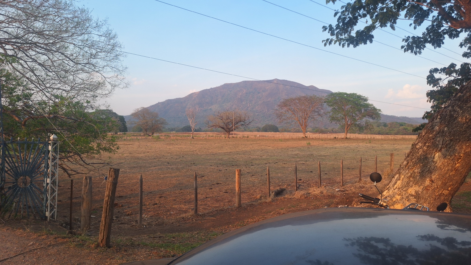 The scene depicts a rural landscape at dusk, located within the municipality of Unknown, Venezuela. The foreground features the dark-colored hood of a vehicle, reflecting a pale blue sky with faint white clouds. To the immediate right, the handlebars and a circular mirror of a motorcycle are partially visible. A large tree trunk, illuminated by warm, low-angle sunlight, slants diagonally into the frame from the right. Mid-ground elements include a dry, reddish-brown field with sparse vegetation, indicating arid conditions. A makeshift fence line constructed from weathered wooden posts separates the immediate foreground from the open field. To the left, a blue metal gate with a decorative sunburst pattern is visible, adjacent to a white concrete or metal post. Beyond the fence, several scattered trees stand across the field; some are bare-branched, while others retain green foliage. Overhead, multiple thin power lines traverse the sky horizontally. The background is dominated by a large, dark-hued mountain range under a clear sky. Further low-lying hills and trees are visible in the distant haze. No human subjects or discernible human activity are present.