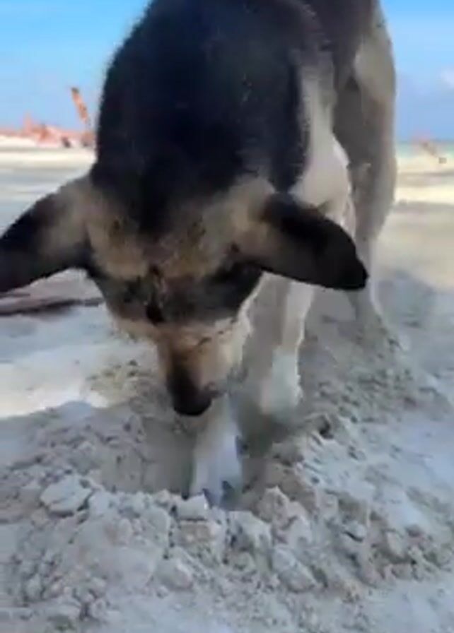 A dog is digging in the sand on a beach. The dog is mostly white with black markings on its back and head. The beach appears crowded with people in the background. The sky is blue and clear. The dog digs with its front paws, kicking up sand. A voice can be heard speaking in an unknown language, apparently addressing the dog.