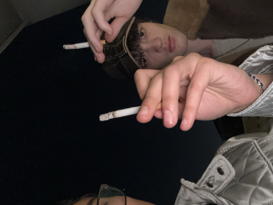 A low-angle perspective shows a young person holding a lit cigarette. Another lit cigarette is visible in the upper left corner. The individual wears a hat and a jacket with a fur-lined collar. Portions of another person wearing glasses and a jacket with buttons are visible in the bottom left and right corners. The background appears to be dark and indistinct.