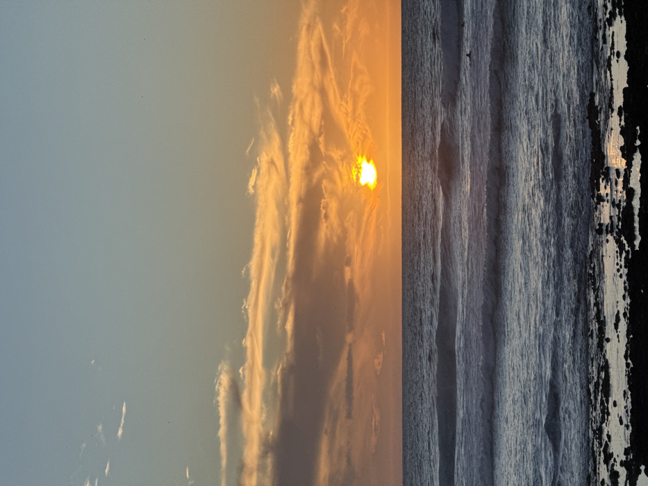 A serene coastal scene is captured, showcasing a radiant sunset partially obscured by wispy clouds in a pale sky. The sun's glow reflects faintly on the tranquil ocean waters, forming gentle waves. A dark, textured coastline occupies the right edge, suggesting rocks or a beach. The composition evokes a sense of calmness and natural beauty. The image is rotated 90 degrees.