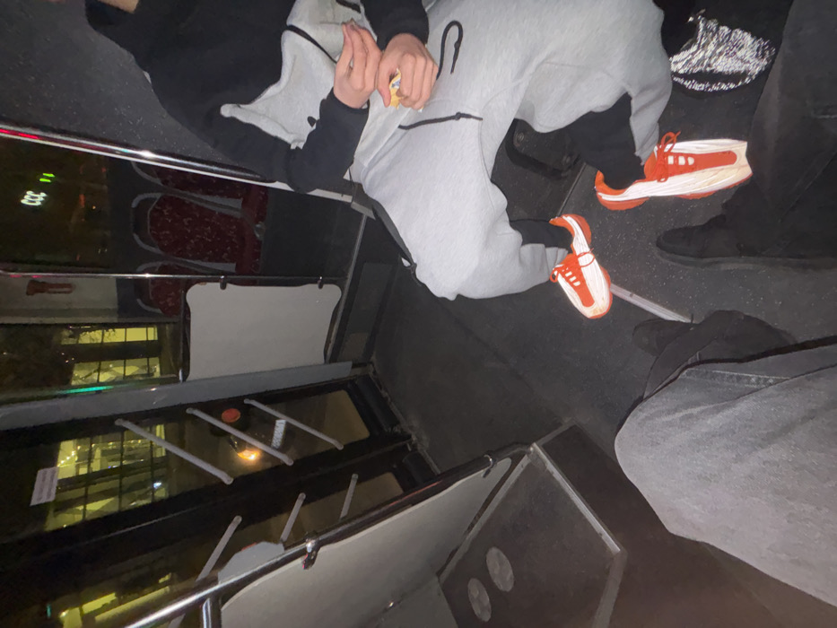 The image displays the interior of a public transport vehicle, likely a bus or trolleybus, at night, in Plovdiv, Bulgaria. Two individuals are seated. The perspective is from the seated position of the first person, whose lower legs and feet, clad in light grey jeans and dark shoes, are visible in the lower left quadrant. Directly opposite and slightly to the right, a second individual is seated, viewed from the waist down. This person wears a two-tone tracksuit consisting of black and light grey sections and prominent orange and white athletic shoes featuring a striped reflective pattern. Their hands are clasped, holding a small, rectangular, light-colored object. A dark bag with a reflective, textured surface is visible on the floor near their feet. The vehicle's interior features dark flooring, silver vertical poles and handrails, and a small white panel attached to the wall. Through the windows on the left and in the background, exterior artificial lighting and faint reflections of buildings, including a "CCC" sign, are visible, indicating the scene takes place after dark. Empty red-patterned seats are reflected in the windows further back.
