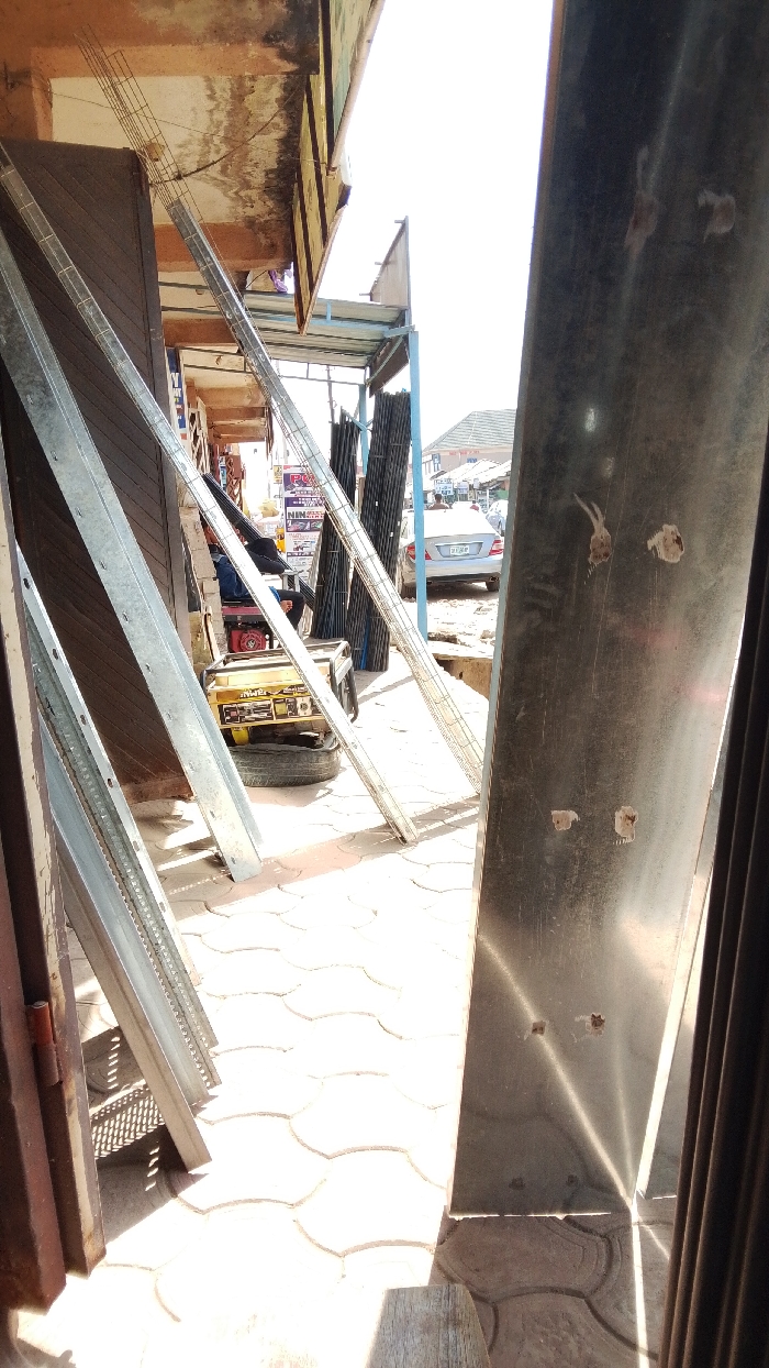 The image depicts an outdoor commercial street scene in Shaba, Nigeria, captured during daylight. In the immediate foreground, a stack of angled, silvery-metallic galvanized steel profiles or beams leans against a dark brown, textured wall on the left. To the right, a large, dark metallic corrugated surface, possibly a shutter or door, stands vertically, displaying multiple impact marks or rust spots and a prominent diagonal light reflection. The ground is paved with light-colored, interlocking hexagonal pavers. In the midground, a partially obscured individual is seated on a surface, visible between the metallic beams. To their right, a yellow portable generator with red accents is positioned on top of a black tire. Behind the generator, various dark, elongated metallic pipes or rods are stacked vertically. Further back, along a street, a silver sedan, likely a Mercedes-Benz, is parked facing away from the viewer, with its rear visible and a partially discernible license plate beginning with "CP-". Several indistinct human figures are visible in the background near the vehicle and further down the street. The background features various buildings with reddish-brown tiled roofs under a bright, clear or hazy sky. The scene is illuminated by direct sunlight, casting shadows.