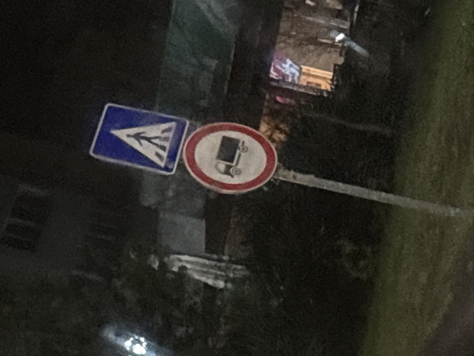 The image presents a low-light, nighttime scene in Dimitrovgrad, Bulgaria. Centrally positioned, a light-colored pole supports two stacked traffic signs. The upper sign is a blue square with a white triangular insert featuring a white silhouette of a pedestrian, indicating a pedestrian crossing. Directly beneath it is a circular sign with a red border and a white interior, displaying a black silhouette of a truck, signifying a restriction or prohibition on trucks. To the left of the pole, dark foliage, likely bushes or trees, occupies the midground, with a diffuse, bright light source visible in the upper-left corner. A vertical, light-colored object or structure is faintly discernible behind the foliage. The ground in the foreground consists of green grass. In the background, on the right side, multiple structures resembling buildings are present. One building exhibits a distinct, brightly illuminated, multi-segment symbol resembling a swastika. Other indistinct light sources emanate from these background structures. No individuals are visible. The overall image is grainy and exhibits characteristics consistent with low-light photography.