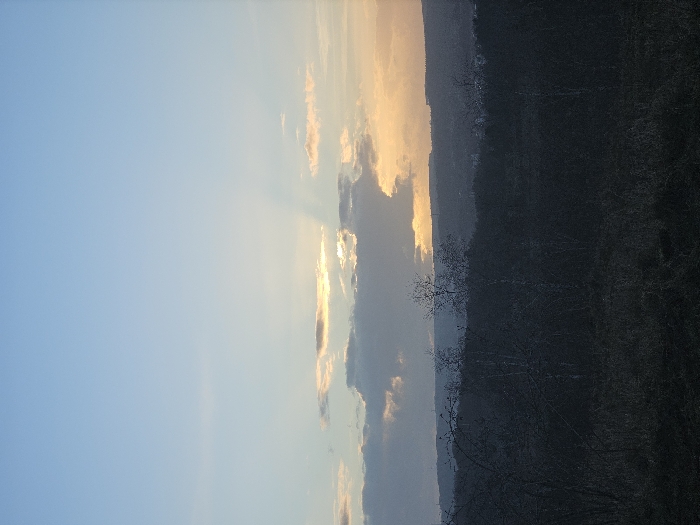 A landscape with a clear, pale blue sky on the left, transitioning to clouds near the center, infused with golden light. The sun's rays pierce through the clouds. On the right, a dark, forested hillside rises, its texture obscured by shadow. Bare trees stand in silhouette against the sky. The scene evokes a tranquil, possibly late-day atmosphere.