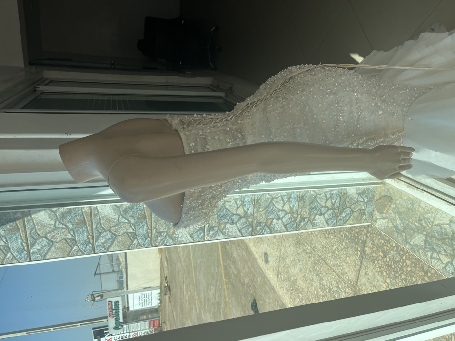 A mannequin arm extends into view wearing a beaded, lacy wedding dress. The dress fills the upper right corner with ruffled white fabric. The arm is positioned near a window showing a street scene with a building sign. The background shifts from exterior views to the interior of a room, where a dark chair is visible. The flooring near the mannequin is a mix of light brown and blue tiling.