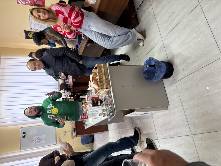 A group of people gather in an office setting, possibly for a social event. A woman in a pink striped sweater leans against a wooden desk, while a man in a black jacket holds a small glass. Another man wearing a green GAP hoodie gestures with a bottle. A table nearby holds various drinks and snacks. A bottle is seen discarded in a blue-lined trash can. An eye chart hangs on a whiteboard on the wall.