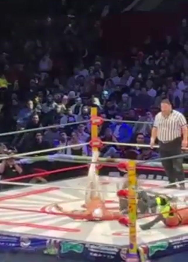 wrestling match in a ring surrounded by a crowd. One wrestler wearing light-colored gear and a checkered flag performs a move on another wrestler wearing dark colors with yellow accents. The wrestler in light gear lands on top of their opponent. A referee in a striped shirt kneels to check on the wrestler who is pinned.