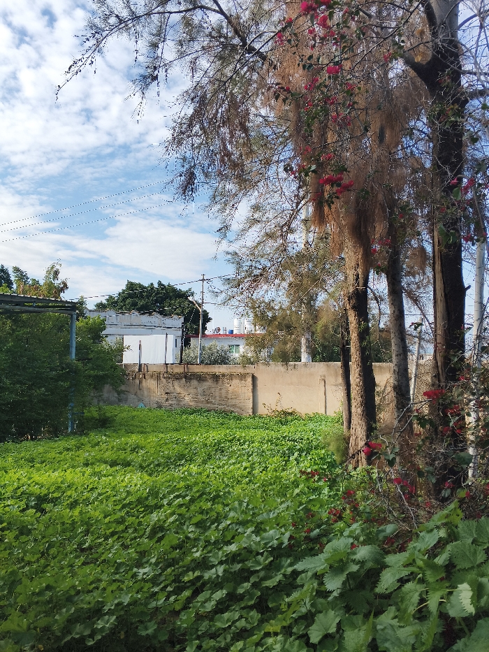 A verdant field of ground cover extends to a concrete wall backdrop. Behind the wall, white buildings with red accents and a water tank are visible. Trees with sparse foliage and vibrant pink flowers dominate the right side. Above, a partly cloudy sky reveals power lines. The scene is bathed in natural light, highlighting the contrast between the greenery and the built environment.