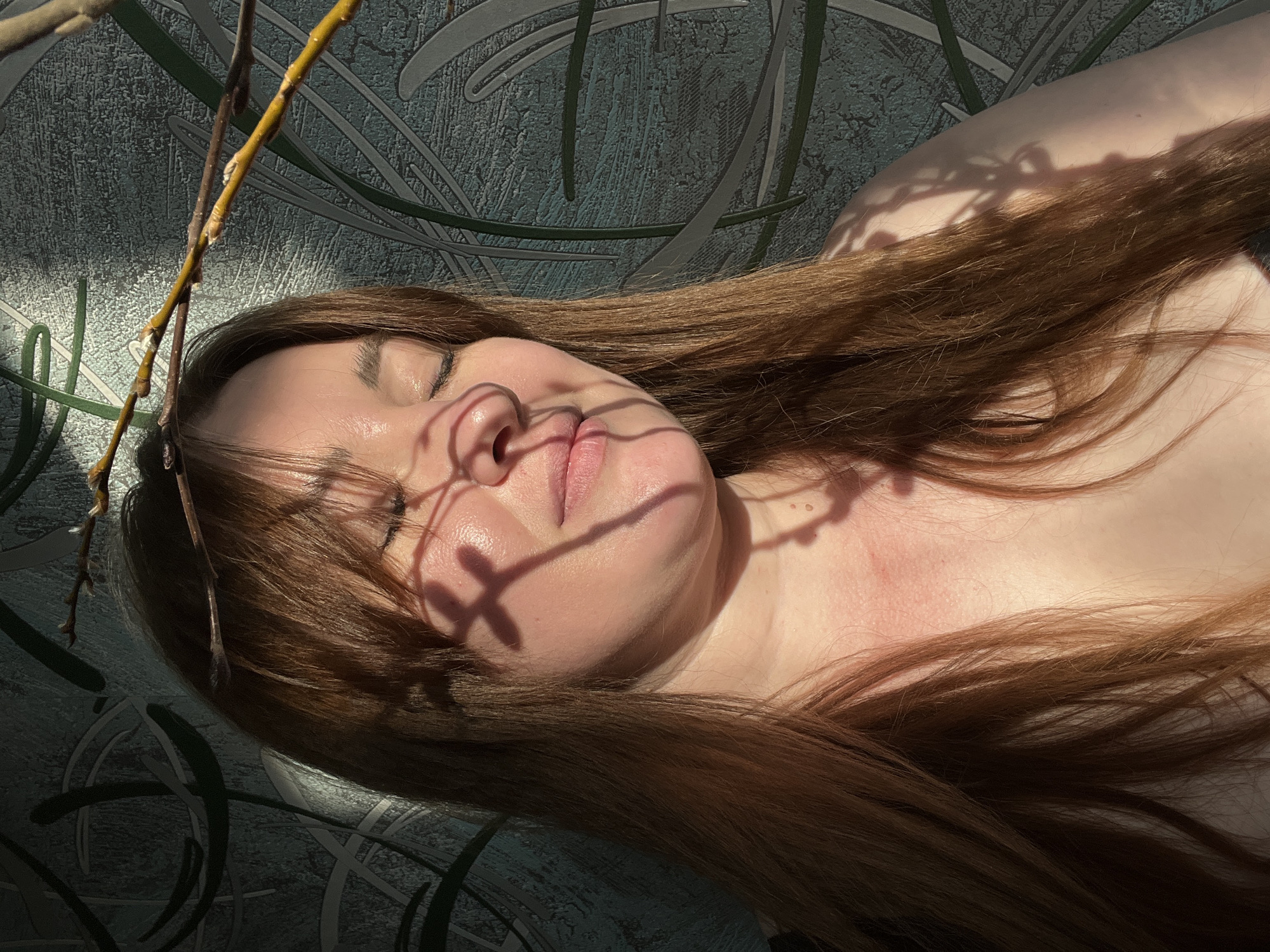A woman with long brown hair is lying down. Light from a window casts shadows of branches on her face and upper chest. The background is a patterned wallpaper in shades of blue and green. It is not possible to verify if the location is Chaikovsky, Russia.