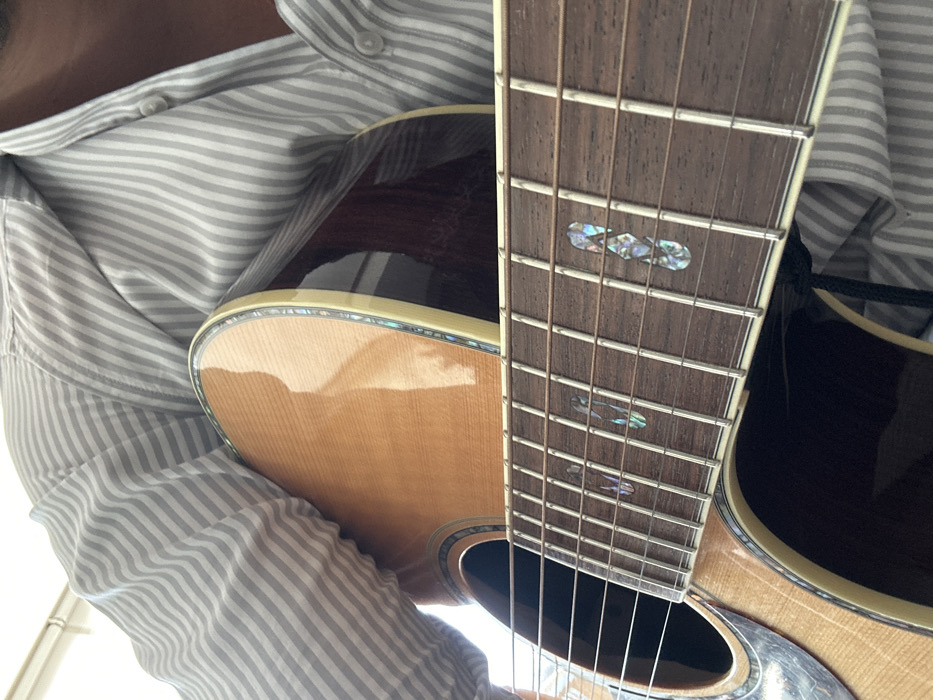 A partial view of an individual's upper torso and right arm is depicted, wearing a light-colored, vertical grey and white striped, long-sleeved button-up shirt. The person is holding an acoustic guitar against their body, oriented for playing. The guitar features a light-toned wooden soundboard with visible grain, dark reddish-brown wooden sides, and multi-layered binding around the body, which includes iridescent abalone inlay. A circular soundhole with an abalone rosette is partially visible. The dark wooden fretboard, adorned with metal frets and distinctive iridescent abalone inlay fret markers (specifically at the 5th and 7th fret positions), is prominent in the foreground, with multiple strings running along its length. The scene is illuminated by soft, natural light, indicating an indoor setting in Interlomas, Mexico.