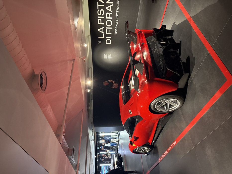The image depicts an indoor automotive exhibition located within the Ferrari Museum in Maranello, Italy, evidenced by signage referencing "LA PISTA DI FIORANO / FIORANO TEST TRACK