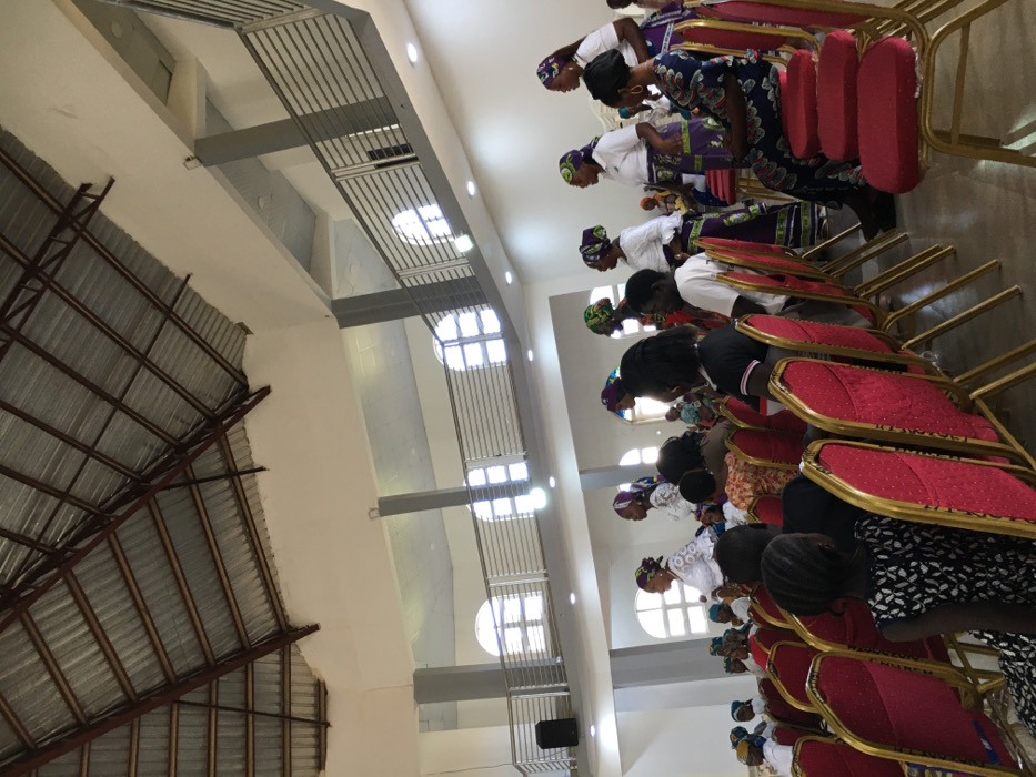 The image displays an indoor gathering within a large, high-ceilinged hall located in Jos, Nigeria