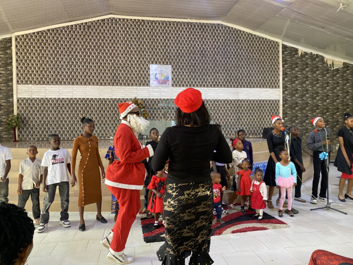 The specific location within Lokoja, Nigeria, is not identifiable from the visual content of the image. The image depicts an indoor scene with approximately 18 to 20 individuals, primarily children, participating in a staged event. A male individual, dressed as Santa Claus in a red suit, white beard, black sunglasses, a red Santa hat, and white sneakers, is positioned center-left, in motion towards the right. To his left, a young woman in a long, brown, vertical-buttoned dress stands static. Further left, two young boys observe, one wearing a white t-shirt with "WRESTLING" text. On the right side of the frame, a group of children of various ages, from toddlers to teenagers, stands in rows. An older girl in a black dress and a red Santa hat, and an older boy in a patterned shirt and a red Santa hat, each hold a microphone on a stand. Younger children, including toddlers in red dresses and a girl in a blue leotard with a pink tutu, are positioned in front of the microphone users. A female, viewed from behind, wearing a black top, a black and gold patterned skirt, and a red beret, faces the group of children. The floor is covered with light-colored square tiles. A small dark rug with red and white circular patterns lies on the floor in the foreground. The back wall features a textured, grid-like pattern with a horizontal white stripe and a single framed picture. The ceiling is a light-colored, possibly fabric or corrugated, structure. The attire and props suggest a Christmas-themed performance or celebration.