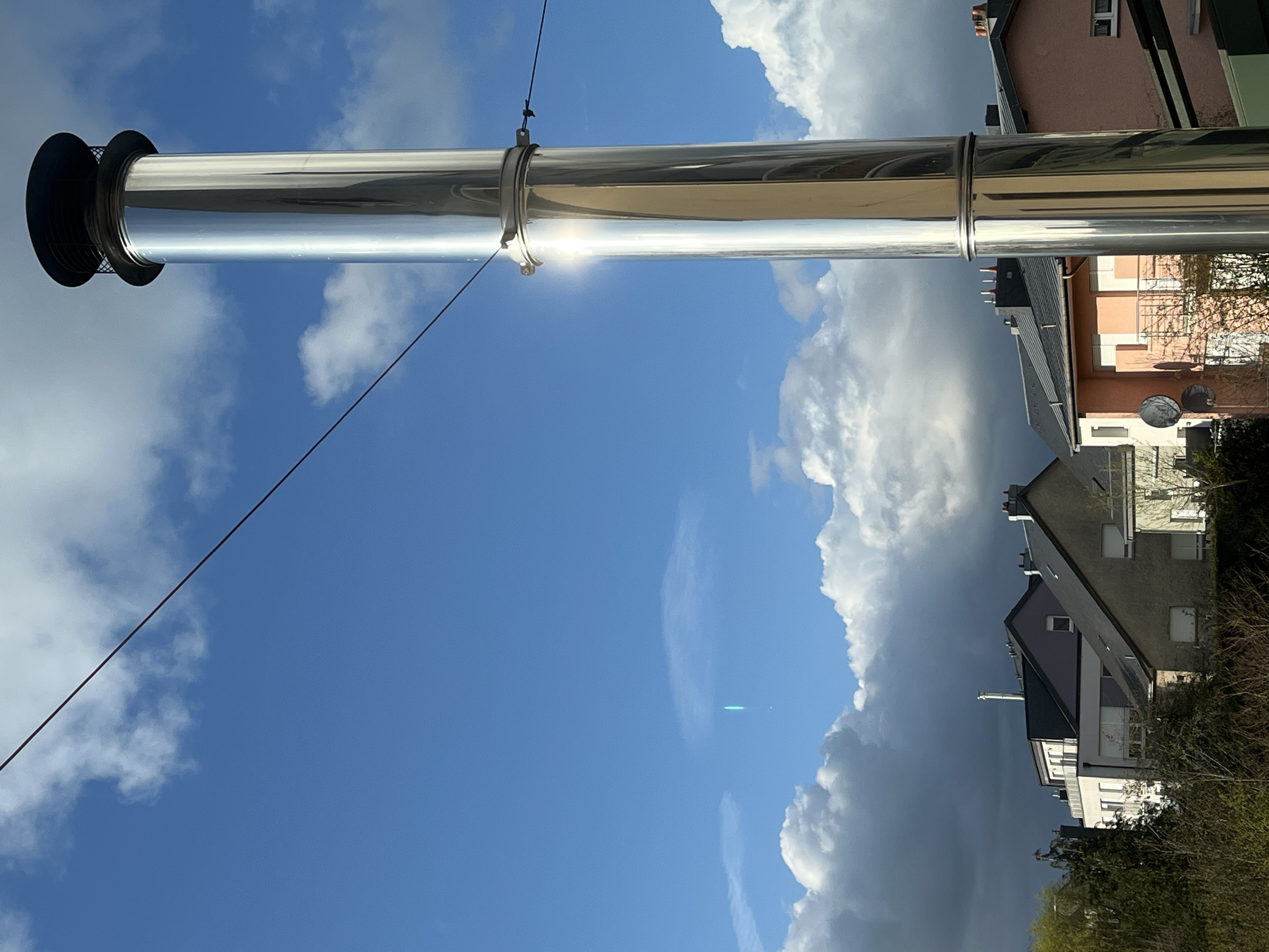 A vertical, polished stainless steel chimney pipe stands prominently on the right side of the frame, reflecting direct sunlight with a bright vertical glare
