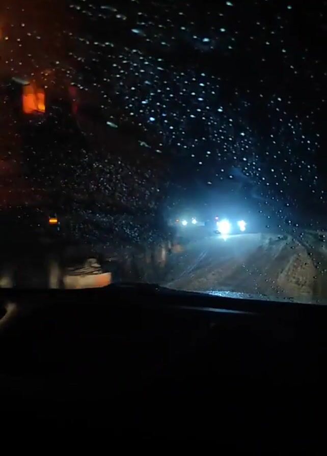 nighttime view from inside a car driving on a snow-covered road. The windshield is wet with raindrops. In the distance, headlights from oncoming vehicles are visible. The road appears unpaved, with tire tracks cutting through the snow. The interior of the car is dark, with only the dashboard visible in the foreground. There are construction signs on the sides of the roads.
