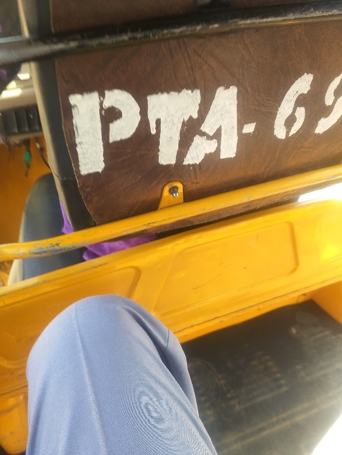 The image captures an interior view from a Keke Napep (motorized tricycle taxi) in Jos, Plateau State, Nigeria. In the foreground, the lower body of an individual is visible, wearing light blue/grey trousers and seated. A bright yellow metal panel, part of the vehicle's interior structure, extends above the person's legs. To the right of the legs, a black rubber mat covers a portion of the floor. The upper half of the image features a brown, textured panel, likely a seat or interior trim, with prominent white stenciled alphanumeric text "PTA-62." This text aligns with Nigerian vehicle registration formats, where "PTA" signifies Plateau State. A black metal bar runs horizontally across the top of the brown panel, with faint glimpses of additional interior components, including a dark vent-like structure, in the upper left background. The scene depicts a passenger's perspective within the Keke Napep.