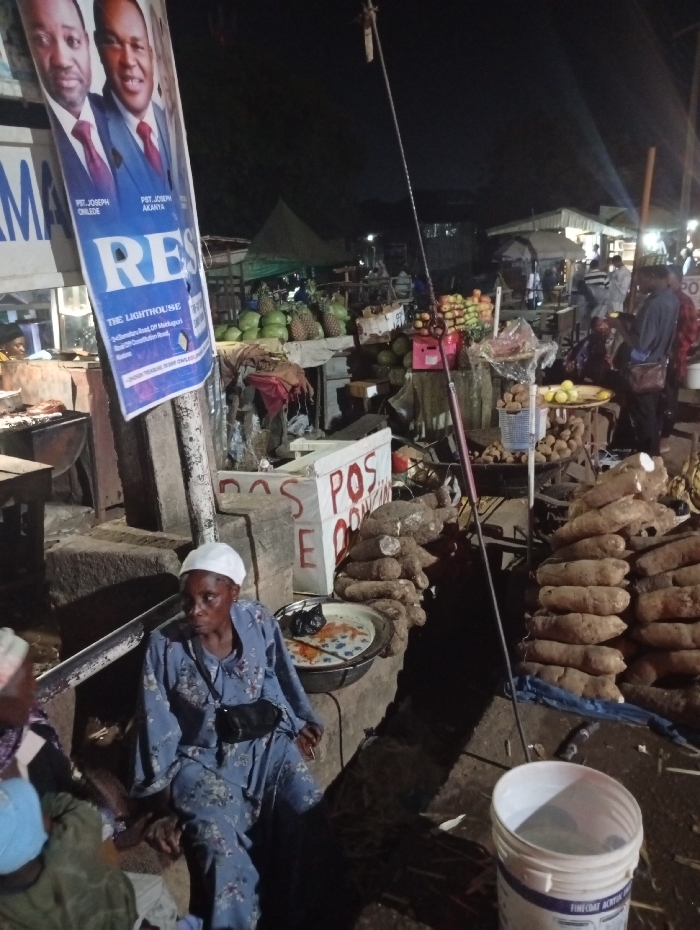 This nighttime image depicts an outdoor market scene in Rido, Nigeria