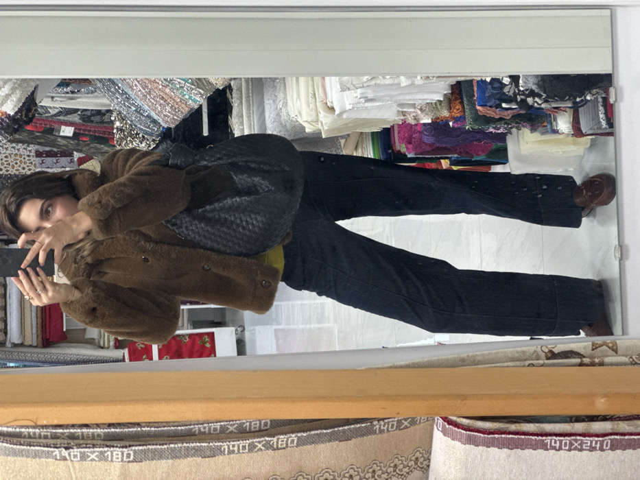 A female subject is depicted in a mirror selfie within an indoor commercial establishment, identified as being in Torres Vedras, Portugal. The subject, appearing in her late teens or early twenties, has medium-brown hair and is holding a black smartphone with a light-colored case to photograph her reflection. She wears a brown faux fur jacket over a yellow garment, dark blue wide-leg jeans, and brown loafers. Rings are visible on the index and ring fingers of her left hand. The reflection shows the subject positioned centrally. To the left of the reflection, fabric rolls are displayed on a wooden stand, with visible text "140 X 180" and "140 X 240" on one roll. The background, beyond the subject's reflection, reveals numerous rolls and stacks of fabrics in various colors and textures on shelving units, consistent with a textile or fabric store. Some fabrics appear to have sequins or glitter. A white-framed mirror encloses the right edge of the reflection. The floor is light-colored and reflective.