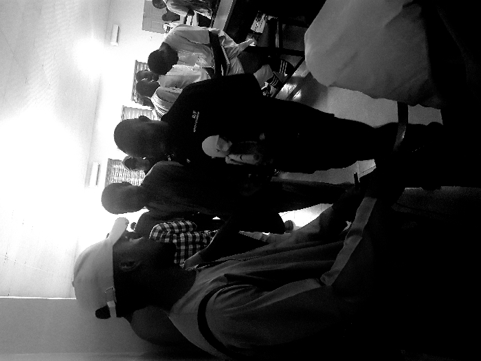 This black and white image, captured in Panhauya, Nigeria, depicts an indoor gathering of approximately ten to fifteen male individuals, likely within a classroom or meeting hall
