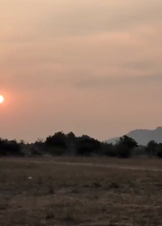 field with sparse vegetation and low brush, likely at dawn or dusk, under a sky with a muted orange glow from the sun. The sun, a bright circular orb, is low in the sky. In the distance are the vague outlines of hills or mountains. The field appears somewhat dry, and the light suggests a time of day near sunrise or sunset. Music is playing during the video.