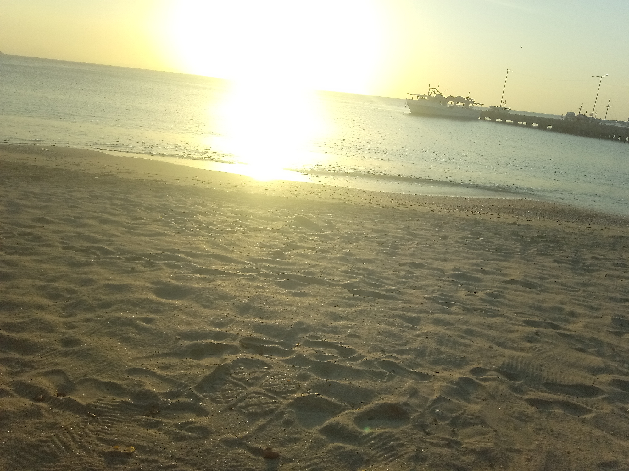 The image depicts a beach scene in Juan Griego, Venezuela at sunrise or sunset. The foreground is sandy beach with visible footprints. The middle ground consists of the ocean reflecting the sunlight. In the background there is a pier and a boat docked. The sky is bright with the sun obscured by the glare.