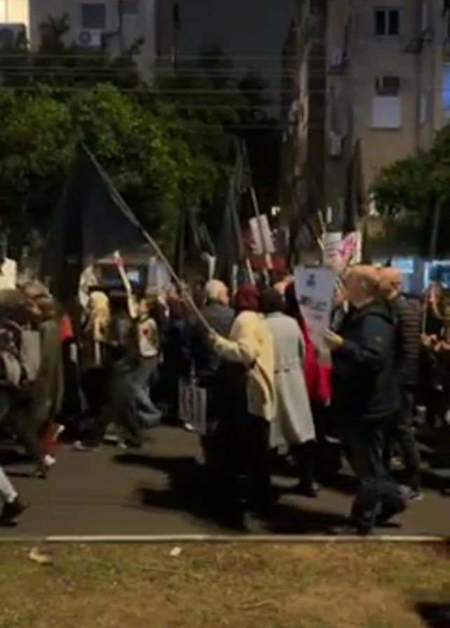 A nighttime street scene shows a crowd of people engaged in a protest or demonstration