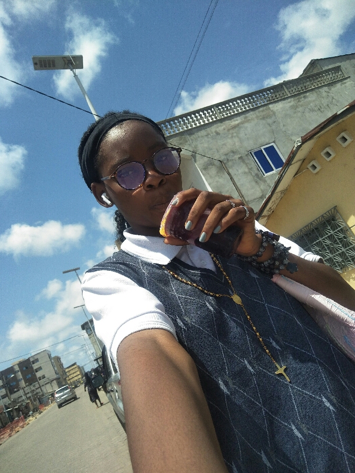 A young Black female is captured in a close-up, upward-angled selfie on an urban street in Cotonou, Benin, during daylight hours under a blue sky with scattered white clouds