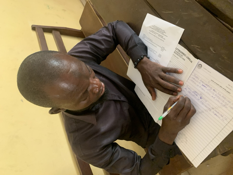 A male individual with short dark hair and a beard is seated at a wooden desk, actively writing on a lined paper with a green transparent ballpoint pen held in his right hand. He is wearing a dark, long-sleeved collared shirt and a dark beaded bracelet on his right wrist. His fingernails are painted a light reddish-orange hue. Adjacent to the lined paper is a document partially titled "LYTECHNIC LOKOJA APPLICATION FORM." The background features a plain light yellow wall and a section of a brown wooden chair or bench. The scene is indoors. The location is contextualized as the city of Abobo, Nigeria, with a visible document referencing "LYTECHNIC LOKOJA."