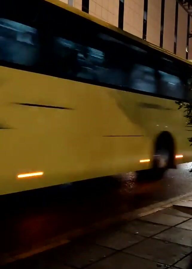 street scene at night. A yellow bus speeds past the camera from left to right. It passes by another yellow bus stopped in the street. A man in a white uniform stands in the street near the stopped bus. Cars pass on the street between the buses. The street has a sidewalk with gray tiles. A tree grows on the sidewalk. Behind the buses is a tall building with vertical rectangular windows. A sign on the building says “نماء”.