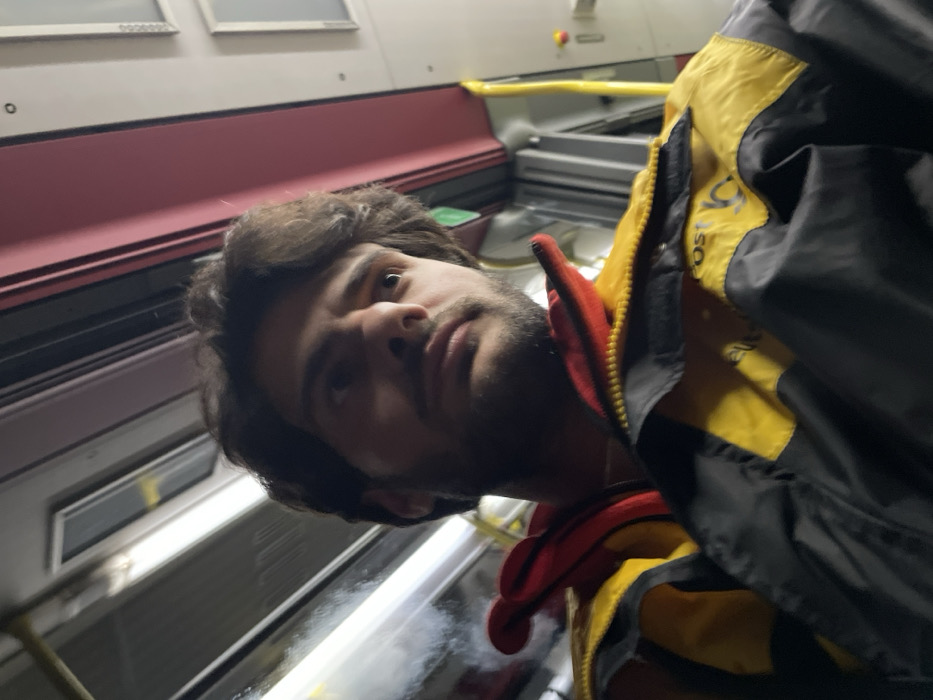A man with brown hair and a beard looks upward in an indoor setting. He's wearing a black and yellow jacket with red accents. The background suggests a train or bus interior, with overhead compartments, lighting, and a red bench or panel. The image has a slightly tilted perspective, creating an unusual angle. A logo appears on the jacket, partially obscured by the zipper.