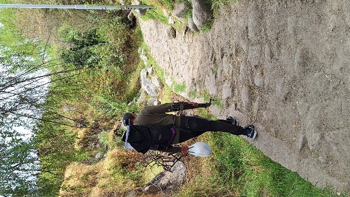 One individual is depicted walking away from the camera on an unpaved, stone-embedded path in Characato, Peru. The person, identified as an adult male, is wearing a dark baseball cap, an olive-green long-sleeved shirt, dark pants, and dark athletic shoes with white soles. A black backpack featuring purple accents is worn on the back. The individual carries a white plastic bag in their left hand and a rifle, equipped with a bipod and oriented downward, in their right hand. The path is flanked by green grass and numerous light-colored boulders. Densely vegetated hillsides, consisting of both green and dry foliage, frame the path. A slender, light-colored utility pole is visible on the right side of the scene.