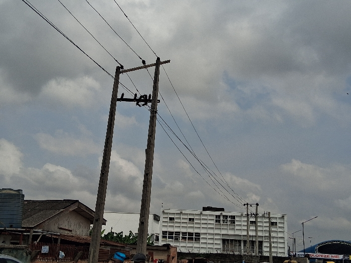 The image depicts an urban street scene in Ikeja GRA, Lagos, Nigeria, specifically near Isaac John Street, identifiable by a partially visible sign displaying "COLONIZE ME!" associated with a local establishment. The sky is overcast with significant cloud cover, providing diffuse lighting. In the mid-ground, two weathered concrete utility poles stand centrally, supporting multiple overhead electrical wires and insulators that crisscross the frame. To the left of these poles, a portion of a low-rise building with a dark corrugated roof and light-colored walls is visible, adjacent to a dark, elevated water tank. Below, a line of vegetation, possibly banana plants, grows behind a fence. At the bottom center, partially obscured by the utility poles, the tops of two individuals' heads are visible; one wears a blue cap, the other a dark cap. Their bodies and any actions are not discernible. In the right mid-ground and background, a prominent multi-story white building with a distinct grid-patterned facade of windows or recessed panels is visible. Further to the right, a large, dark blue or black curved structure, possibly an awning or roof element, is present, with the aforementioned "COLONIZE ME!" sign positioned beneath it. A black street light pole is also visible on the right. No specific interactions or dynamic actions are evident within the static scene.