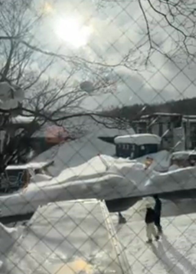 winter scene viewed through a window with a wire mesh. Outside, the ground and rooftops are covered with deep snow. The sun shines through thin clouds. There are trees with bare branches in the foreground. Two people walk along a path cleared through the snow-covered street. Several orange traffic cones are visible along the edge of the path. There are snow-covered structures in the background, likely buildings and vehicles.