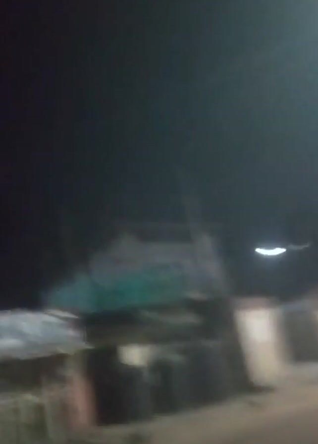 street scene at night. The camera appears to be moving, though the movement is unsteady. A car with headlights on approaches in the distance. A group of people are standing on the side of the road near a building with what looks like blue curtains or tarps. Streetlights illuminate the scene. A pole or tree is visible on the right side of the frame.