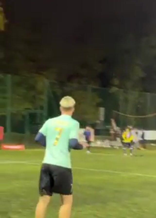 On an outdoor sports field at night, a man in a light green jersey with the number 7 on the back, black shorts, and white socks watches as other people play a soccer-like game. A soccer-style net can be seen in the background. The man in the green jersey is standing still, watching the other players, then turns toward the right side of the field.