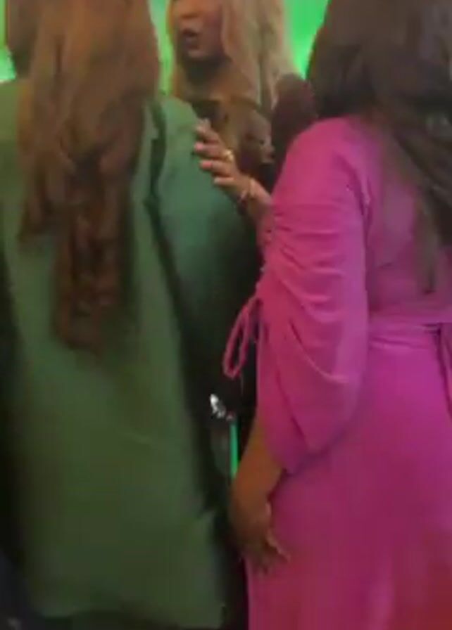 group of women socializing at what appears to be a party or event. The women are dressed in vibrant colors - pink, green and black. The lighting in the room shifts between red and green, suggesting a dynamic atmosphere. The women seem to be talking, though their individual conversations are indiscernible. Overall, the video captures a lively social gathering with people engaged in conversation and interaction.