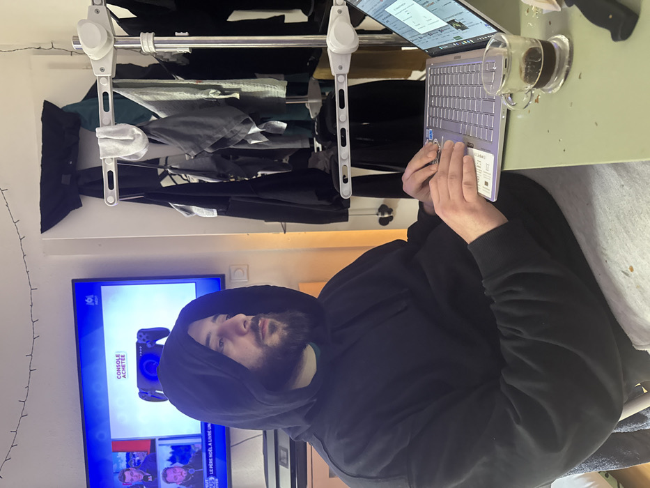 The image displays an indoor residential setting in Strasbourg, France. A bearded adult male, wearing a black hooded sweatshirt with the hood up and light-colored sweatpants, is seated at a light green desk. His hands are positioned over a silver-toned laptop, indicating active use. A clear glass cup containing dark liquid, consistent with coffee, rests on the desk to the right of the laptop. In the background, a flat-screen television is mounted on a white wall, displaying a French news broadcast with visible text "CONSOLE ACHETÉE" and multiple on-screen figures. To the right of the male, a white modular clothes rack is laden with various garments, including t-shirts and socks. Additional dark clothing is draped over a door or fixture behind the rack. A string of small, dark fairy lights is installed high on the wall, and a circular white electrical outlet is visible below the television. A black electronic device is positioned on a shelf beneath the TV.