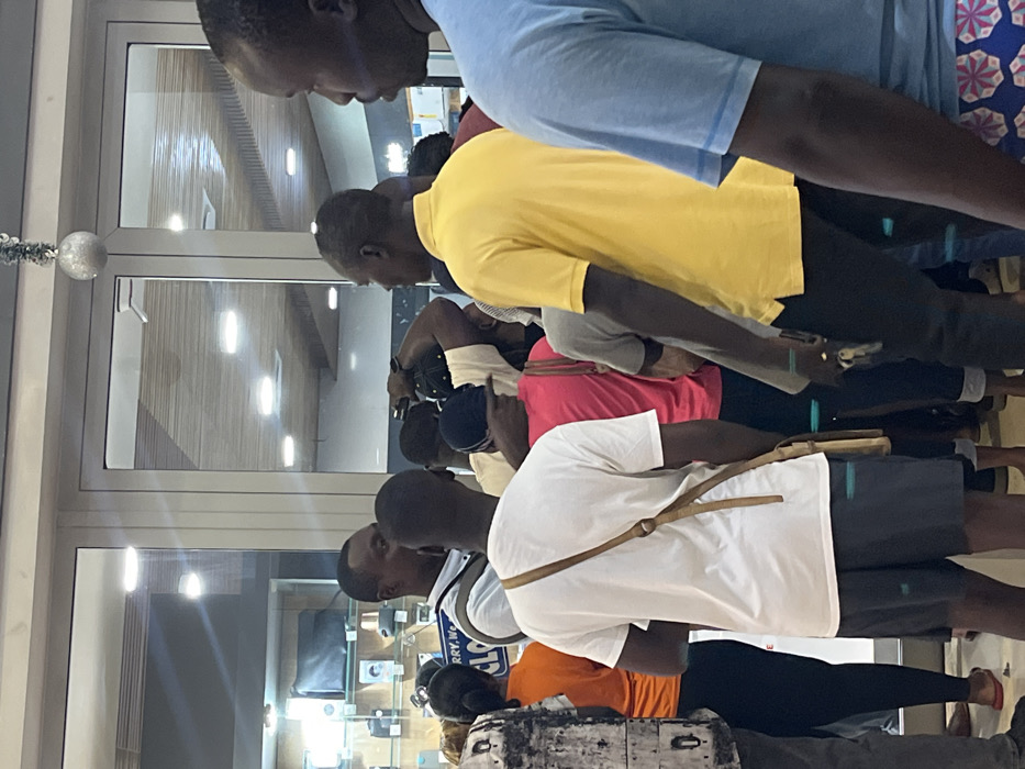 The image depicts an indoor scene at a commercial establishment in Mile 11, Ghana