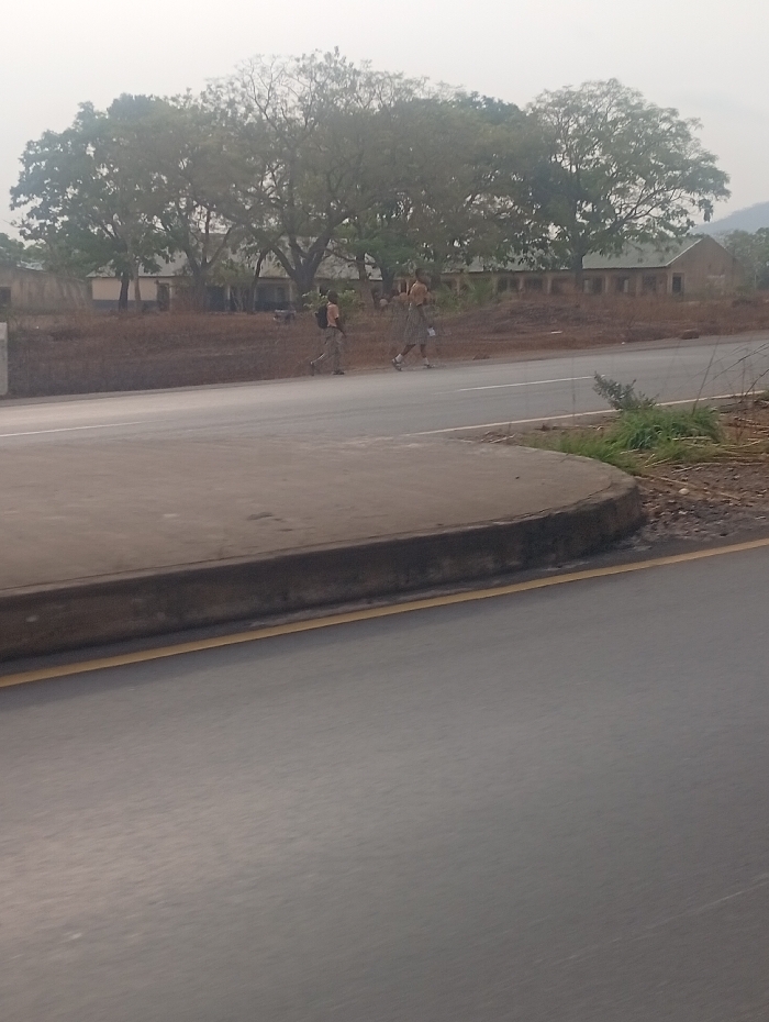 two young men in school uniforms walking across a paved road in Vana, Nigeria, at coordinates 8.833 latitude, 8.453 longitude. There are trees and some low-rise buildings on the opposite side of the road. The men are walking in the same direction, and are both carrying bags on their backs. One man is slightly ahead of the other. The image is taken from a low angle, looking down at the road from a car or van. The road surface is gray and has a yellow line painted on it. There is a grass verge on the right side of the image. There is a concrete curb separating the road from the verge. There is a white concrete wall in the left foreground, and a building with a green roof in the background. The sky is overcast. The scene is relatively empty, with no other people or vehicles visible.