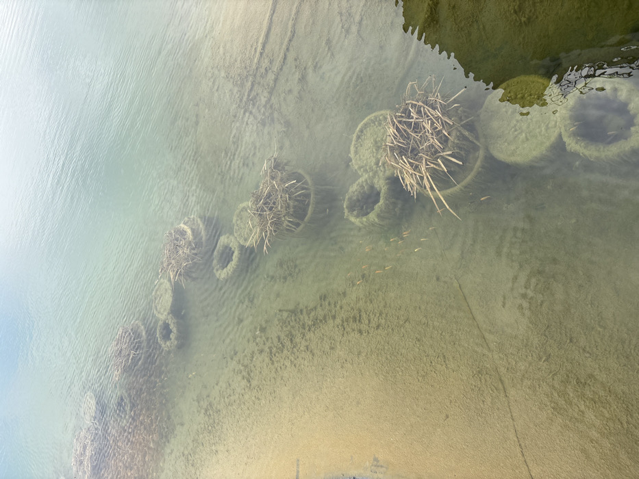 A shallow, turbid water body in Зеленогорское сельское поселение, Ukraine, is depicted. The underwater substrate transitions from a sandy bank on the left to a sediment-covered, greenish bottom. A linear series of at least eleven submerged circular structures, consistent with tires or concrete culverts, extends diagonally from the lower right foreground towards the upper left background. Several of these circular structures contain dense bundles of dry, brown fibrous plant matter, resembling reeds or grass. A school of approximately 10-15 small, light-orange fish is observed swimming near the center-left of the frame, adjacent to these structures. The water's surface exhibits minor ripples. A dark, possibly algae-covered, reflective edge is present on the far right of the image. No individuals are present.