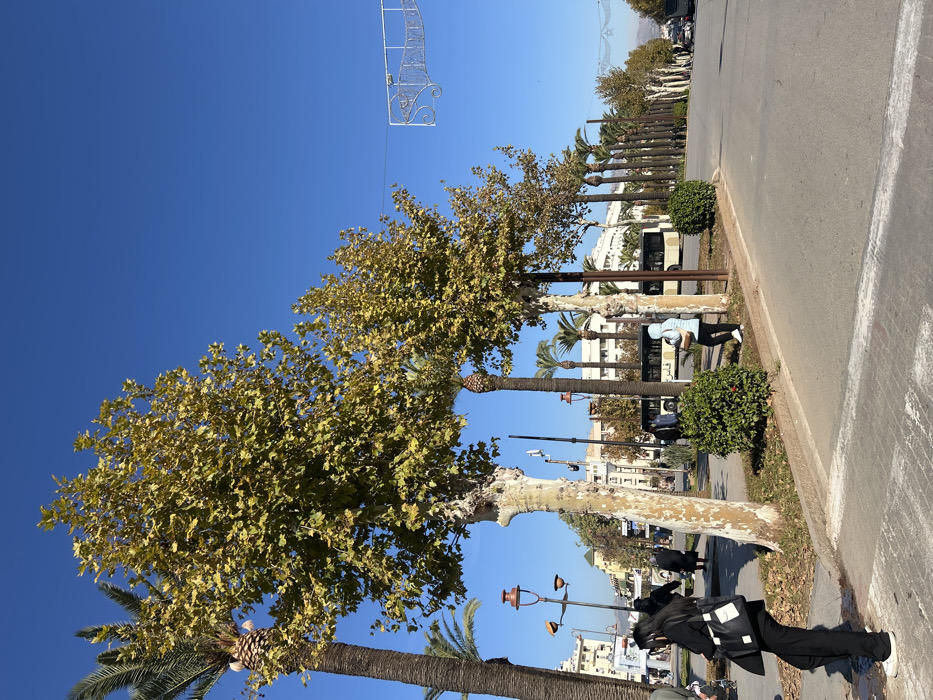 The image displays an urban street scene in Fez, Morocco, under a clear blue sky during daylight hours. A wide asphalt road dominates the midground and background, extending into the distance, with visible white pedestrian crossing markings in the foreground. On the immediate left, a person with dark hair, dressed in a black long-sleeved top, black wide-leg trousers, and white sneakers, stands on a paved surface, facing left. They carry a black and white tote bag over their right shoulder. Behind them, several other indistinct figures are visible on a sidewalk. A median strip, featuring green grass, small manicured bushes, and several trees with yellowish-green leaves and pale, mottled trunks, separates sections of the road. Tall palm trees are interspersed among these deciduous trees, and a consistent row of palm trees lines the right side of the street extending into the background. On the median strip in the midground, a person wearing a light blue hooded jacket, dark pants, and white sneakers stands facing right, near a small green bush. Across the road in the midground, a white and yellow city bus is parked or stopped. Multi-story, light-colored buildings with multiple windows line the background, visible beyond the street and other vehicles. Dark-colored streetlights with orange-tinted luminaires are visible on the left side of the median. A white metallic decorative banner, featuring scrollwork, is suspended high above the street on the right side of the frame.